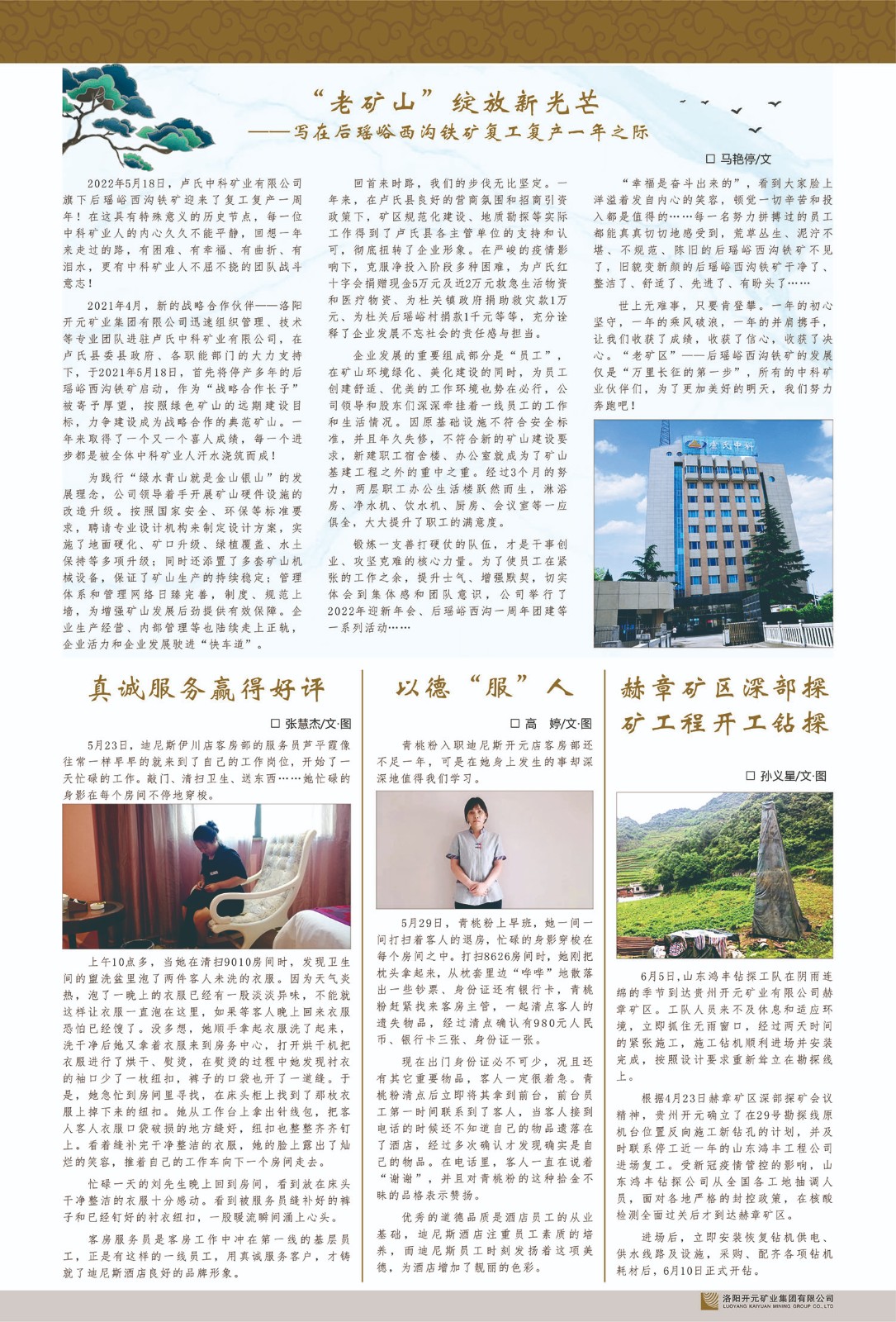 洛陽開元礦業(yè)集團(tuán)有限公司簡介洛陽開元礦業(yè)集團(tuán)有限公司,始成立于2006年,位于洛陽市開元大道269號。集團(tuán)旗下共有十余家全資子公司,業(yè)務(wù)涉及有色金屬礦山開發(fā)、礦產(chǎn)品購銷與進(jìn)出口貿(mào)易、房地產(chǎn)開發(fā)、文化藝術(shù)、企業(yè)管理與咨詢、資本投資等多個領(lǐng)域。2024年,集團(tuán)公司銷售總額達(dá)7.8億元。民建河南省委委員、民建河南省委企業(yè)委副主任、民建洛陽市委委員、企業(yè)委主任、洛陽民建企業(yè)家協(xié)會會長許明月是公司創(chuàng)始人,現(xiàn)任洛陽開元礦業(yè)集團(tuán)有限公司董事長。在礦業(yè)領(lǐng)域,洛陽開元礦業(yè)集團(tuán)擁有多家實(shí)力雄厚的子公司:貴州開元礦業(yè)有限公司探、采礦權(quán)面積共11.33平方公里;興海縣銅鑫礦業(yè)有限公司探礦權(quán)面積8.76平方公里,礦山資源潛力巨大;2021年,開元集團(tuán)與盧氏中科礦業(yè)有限公司開展戰(zhàn)略合作。盧氏中科礦業(yè)有限公司專注于有色金屬的浮選、加工和銷售,擁有強(qiáng)大的技術(shù)支撐平臺,是集探、采、選、冶、研為一體的中大型綜合礦業(yè)企業(yè)。目前,盧氏中科王家河1000噸選礦廠已成功投產(chǎn),雙河金礦、柳關(guān)欒盧鉛鋅礦相繼順利開工,樓房銀礦與圪老灣鉛鋅礦的深部探礦重大突破,標(biāo)志著礦山版圖取得重大進(jìn)展,為開元集團(tuán)后續(xù)發(fā)展奠定了堅(jiān)實(shí)基礎(chǔ)。在文化傳媒領(lǐng)域,洛陽市明月美術(shù)館通過豐富多樣的藝術(shù)展覽、學(xué)術(shù)研討和公共教育活動,努力打造一個集展覽、交流、教育、研究為一體的綜合性藝術(shù)平臺。此外,在金融投資領(lǐng)域,開元集團(tuán)旗下的北京明峰資本管理有限公司專注于投資具有高增長潛力的優(yōu)秀企業(yè),特別是高科技、新能源、環(huán)保等新興產(chǎn)業(yè),為客戶提供個性化的資產(chǎn)配置服務(wù)。在做好企業(yè)經(jīng)營的同時,開元集團(tuán)始終不忘企業(yè)的社會責(zé)任和家國情懷,以突出的愛心公益事跡,開展了一系列公益慈善活動:“民建林”公益事業(yè)通過“思源基金”“幫幫公益”線上公益平臺,與眾多愛心人士籌措資金20余萬元;資助541名貧困大學(xué)生共計(jì)270余萬元,推進(jìn)“數(shù)字助力——河南AI人才培養(yǎng)”;捐款10萬元,馳援京津冀、黑龍江洪水地質(zhì)災(zāi)害……公司于2017年底被洛陽市慈善總會評為“洛陽慈善風(fēng)云榜——十大愛心集體”。洛陽開元礦業(yè)集團(tuán)有限公司秉承持續(xù)發(fā)展理念,憑借多年來良好的企業(yè)信譽(yù)與經(jīng)營業(yè)績,與全國多家企業(yè)建立了良好合作關(guān)系,受到社會各界的一致好評,多次榮獲“納稅標(biāo)兵”“先進(jìn)企業(yè)”“招商引資模范企業(yè)”等榮譽(yù)稱號。回望來時路,開元人勠力同心,以“闖”的精神和“創(chuàng)”的勁頭,一路披荊斬棘,踏過千山萬水;展望新未來,開元人凝心聚力,不執(zhí)于“舊”,無畏于“新”,秉承“勇于跨越,追求卓越”的企業(yè)精神,乘著國家高質(zhì)量發(fā)展新征程的東風(fēng),跨過高山,越過大海,向著集團(tuán)多元化、國際化的目標(biāo),逐夢遠(yuǎn)航,跨越前行!
